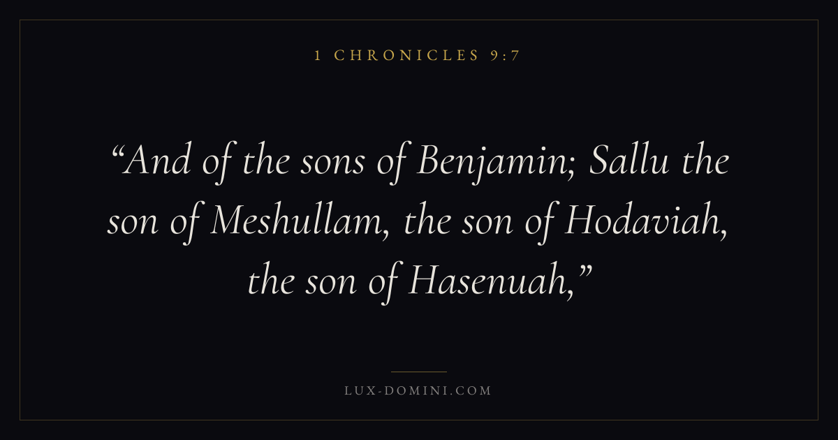And of the sons of Benjamin; Sallu the son of Meshullam, the son of Hodaviah, the son of Hasenuah,