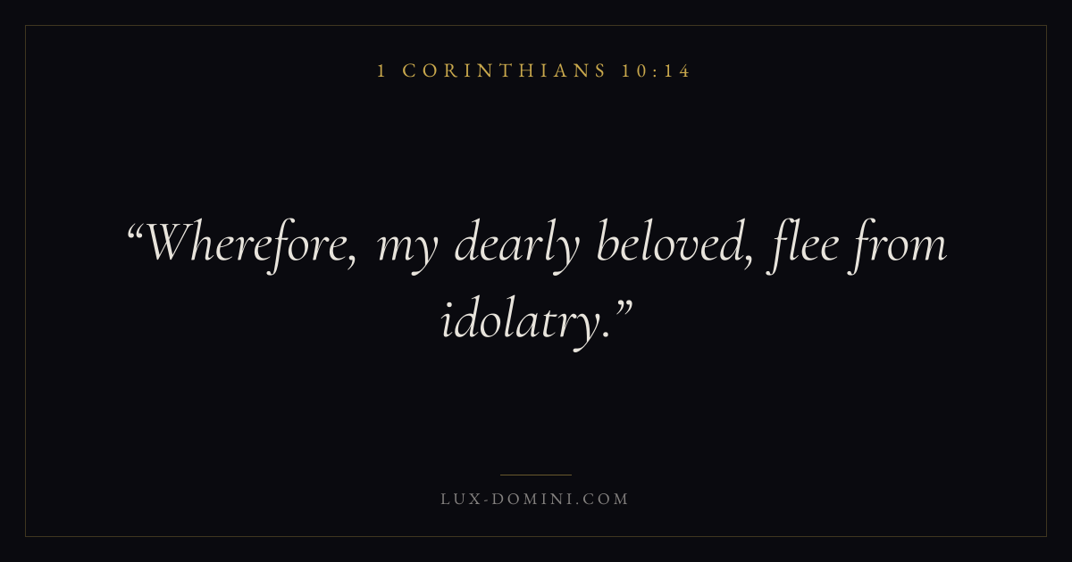 Books / 1 Corinthians / Chapter 10 / Verse 14 ← 1 Corinthians 10:13 1 Corinthians 10:14 1 Corinthians 10:15 → Wherefore, my dearly beloved, flee from idolatry. Download verse card Share on Twitter Share on Facebook Pin it ✦ Key themes LoveAnxiety and fearEternal lifeThe cross Read with 1 Corinthians 10:15John 3:161 Corinthians 13:4Philippians 4:6 Related topics Bible verses about loveBible verses about anxiety and fearBible verses about eternal life ✦ 1 Corinthians Chapter 10 verses V. 1 V. 2 V. 3 V. 4 V. 5 V. 6 V. 7 V. 8 V. 9 V. 10 V. 11 V. 12 V. 13 V. 14 V. 15 V. 16 V. 17 V. 18 V. 19 V. 20 V. 21 V. 22 V. 23 V. 24 V. 25 V. 26 V. 27 V. 28 V. 29 V. 30 V. 31 V. 32 V. 33