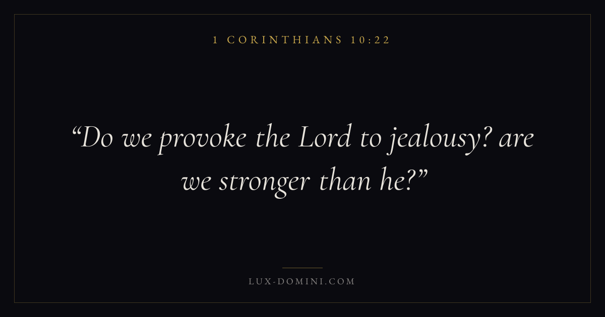 Books / 1 Corinthians / Chapter 10 / Verse 22 ← 1 Corinthians 10:21 1 Corinthians 10:22 1 Corinthians 10:23 → Do we provoke the Lord to jealousy? are we stronger than he? Download verse card Share on Twitter Share on Facebook Pin it ✦ Key themes LoveFaithSalvationEternal lifeThe cross Read with 1 Corinthians 10:21John 3:161 Corinthians 13:4Hebrews 11:1 Related topics Bible verses about loveBible verses about faithBible verses about salvationBible verses about eternal life ✦ 1 Corinthians Chapter 10 verses V. 1 V. 2 V. 3 V. 4 V. 5 V. 6 V. 7 V. 8 V. 9 V. 10 V. 11 V. 12 V. 13 V. 14 V. 15 V. 16 V. 17 V. 18 V. 19 V. 20 V. 21 V. 22 V. 23 V. 24 V. 25 V. 26 V. 27 V. 28 V. 29 V. 30 V. 31 V. 32 V. 33