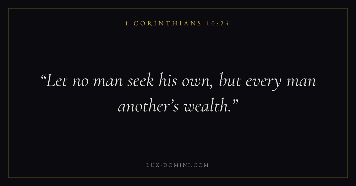 Books / 1 Corinthians / Chapter 10 / Verse 24 ← 1 Corinthians 10:23 1 Corinthians 10:24 1 Corinthians 10:25 → Let no man seek his own, but every man another’s wealth. Download verse card Share on Twitter Share on Facebook Pin it ✦ Key themes LoveEternal lifeThe crossChurch order Read with 1 Corinthians 10:23John 3:161 Corinthians 13:4John 17:3 Related topics Bible verses about loveBible verses about eternal life ✦ 1 Corinthians Chapter 10 verses V. 1 V. 2 V. 3 V. 4 V. 5 V. 6 V. 7 V. 8 V. 9 V. 10 V. 11 V. 12 V. 13 V. 14 V. 15 V. 16 V. 17 V. 18 V. 19 V. 20 V. 21 V. 22 V. 23 V. 24 V. 25 V. 26 V. 27 V. 28 V. 29 V. 30 V. 31 V. 32 V. 33