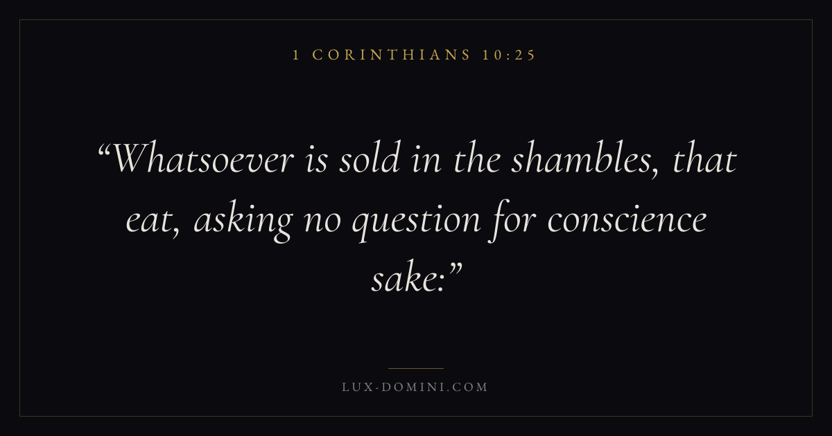 Books / 1 Corinthians / Chapter 10 / Verse 25 ← 1 Corinthians 10:24 1 Corinthians 10:25 1 Corinthians 10:26 → Whatsoever is sold in the shambles, that eat, asking no question for conscience sake: Download verse card Share on Twitter Share on Facebook Pin it ✦ Key themes LovePrayerEternal lifeThe cross Read with 1 Corinthians 10:26John 3:161 Corinthians 13:4Matthew 6:9 Related topics Bible verses about loveBible verses about prayerBible verses about eternal life ✦ 1 Corinthians Chapter 10 verses V. 1 V. 2 V. 3 V. 4 V. 5 V. 6 V. 7 V. 8 V. 9 V. 10 V. 11 V. 12 V. 13 V. 14 V. 15 V. 16 V. 17 V. 18 V. 19 V. 20 V. 21 V. 22 V. 23 V. 24 V. 25 V. 26 V. 27 V. 28 V. 29 V. 30 V. 31 V. 32 V. 33