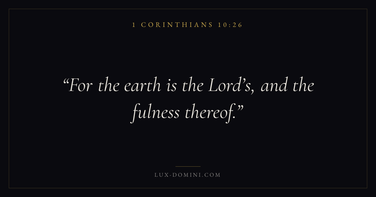 Books / 1 Corinthians / Chapter 10 / Verse 26 ← 1 Corinthians 10:25 1 Corinthians 10:26 1 Corinthians 10:27 → For the earth is the Lord’s, and the fulness thereof. Download verse card Share on Twitter Share on Facebook Pin it ✦ Key themes LoveEternal lifeThe crossChurch order Read with 1 Corinthians 10:25John 3:161 Corinthians 13:4John 17:3 Related topics Bible verses about loveBible verses about eternal life ✦ 1 Corinthians Chapter 10 verses V. 1 V. 2 V. 3 V. 4 V. 5 V. 6 V. 7 V. 8 V. 9 V. 10 V. 11 V. 12 V. 13 V. 14 V. 15 V. 16 V. 17 V. 18 V. 19 V. 20 V. 21 V. 22 V. 23 V. 24 V. 25 V. 26 V. 27 V. 28 V. 29 V. 30 V. 31 V. 32 V. 33