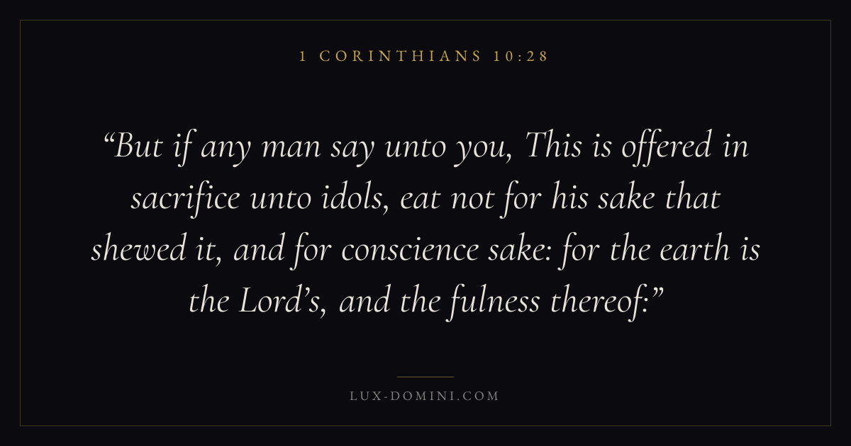 But if any man say unto you, This is offered in sacrifice unto idols, eat not for his sake that shewed it, and for conscience sake: for the earth is the Lord’s, and the fulness thereof: