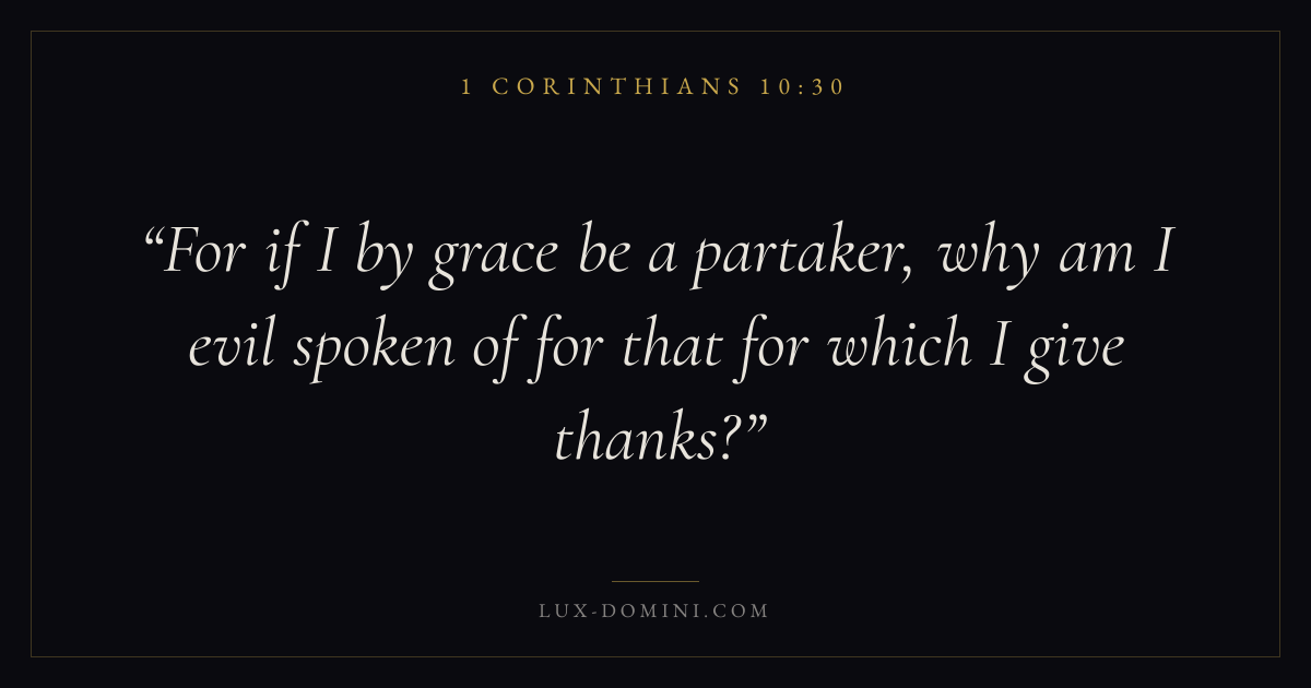 Books / 1 Corinthians / Chapter 10 / Verse 30 ← 1 Corinthians 10:29 1 Corinthians 10:30 1 Corinthians 10:31 → For if I by grace be a partaker, why am I evil spoken of for that for which I give thanks? Download verse card Share on Twitter Share on Facebook Pin it ✦ Key themes LoveEternal lifeGraceThe cross Read with 1 Corinthians 10:271 Corinthians 10:28John 3:161 Corinthians 13:4 Related topics Bible verses about loveBible verses about eternal lifeBible verses about grace ✦ 1 Corinthians Chapter 10 verses V. 1 V. 2 V. 3 V. 4 V. 5 V. 6 V. 7 V. 8 V. 9 V. 10 V. 11 V. 12 V. 13 V. 14 V. 15 V. 16 V. 17 V. 18 V. 19 V. 20 V. 21 V. 22 V. 23 V. 24 V. 25 V. 26 V. 27 V. 28 V. 29 V. 30 V. 31 V. 32 V. 33