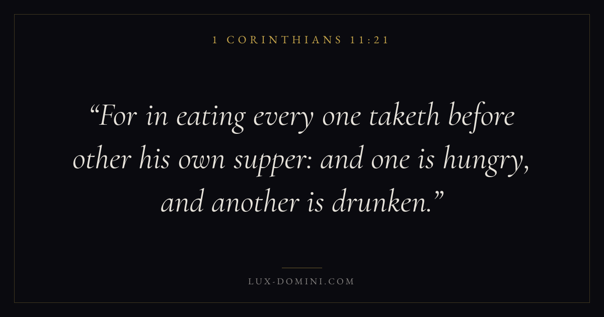 For in eating every one taketh before other his own supper: and one is hungry, and another is drunken.