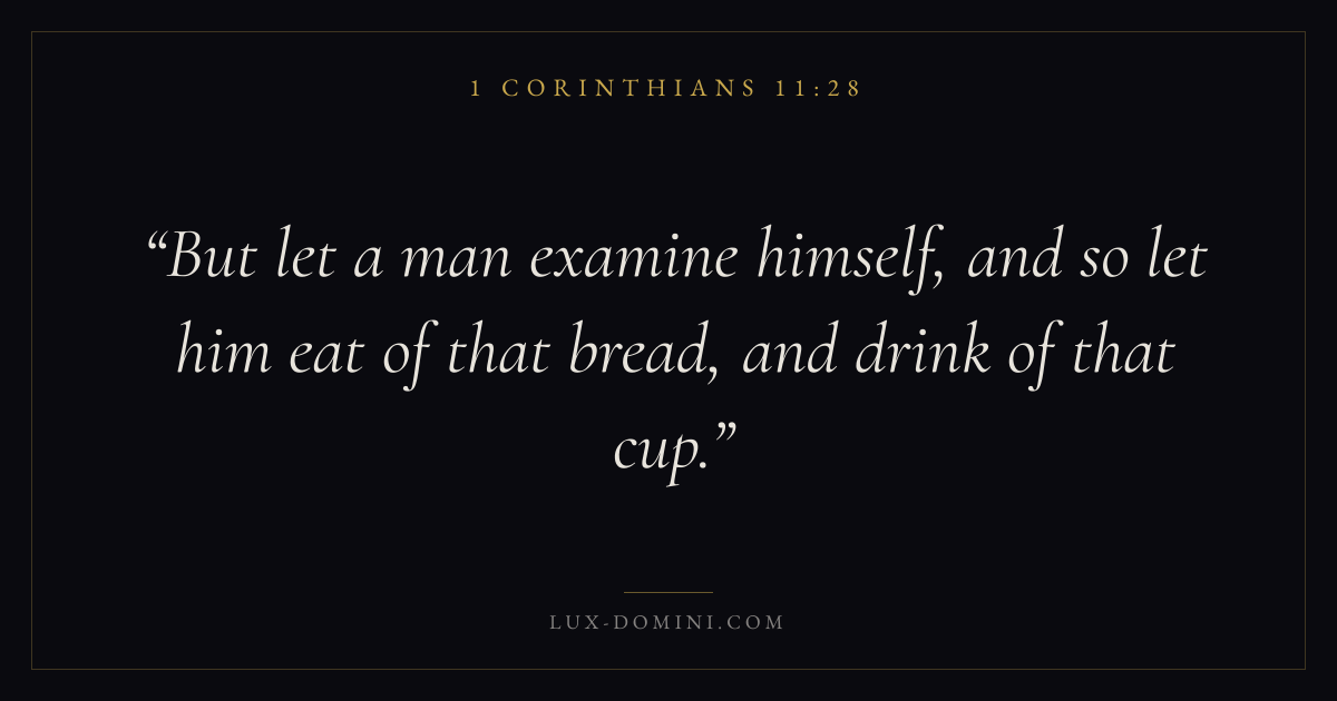 Books / 1 Corinthians / Chapter 11 / Verse 28 ← 1 Corinthians 11:27 1 Corinthians 11:28 1 Corinthians 11:29 → But let a man examine himself, and so let him eat of that bread, and drink of that cup. Download verse card Share on Twitter Share on Facebook Pin it ✦ Key themes LoveWisdomEternal lifeThe cross Read with 1 Corinthians 11:251 Corinthians 11:26John 3:161 Corinthians 13:4 Related topics Bible verses for communionBible verses about loveBible verses about wisdomBible verses about eternal life ✦ 1 Corinthians Chapter 11 verses V. 1 V. 2 V. 3 V. 4 V. 5 V. 6 V. 7 V. 8 V. 9 V. 10 V. 11 V. 12 V. 13 V. 14 V. 15 V. 16 V. 17 V. 18 V. 19 V. 20 V. 21 V. 22 V. 23 V. 24 V. 25 V. 26 V. 27 V. 28 V. 29 V. 30 V. 31 V. 32 V. 33 V. 34