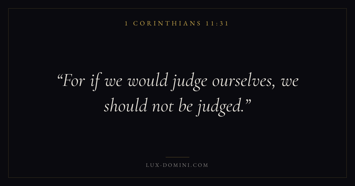 Books / 1 Corinthians / Chapter 11 / Verse 31 ← 1 Corinthians 11:30 1 Corinthians 11:31 1 Corinthians 11:32 → For if we would judge ourselves, we should not be judged. Download verse card Share on Twitter Share on Facebook Pin it ✦ Key themes LoveWisdomJustice and mercyEternal lifeThe cross Read with 1 Corinthians 11:301 Corinthians 11:32John 3:161 Corinthians 13:4 Related topics Bible verses about loveBible verses about wisdomBible verses about justice and mercyBible verses about eternal life ✦ 1 Corinthians Chapter 11 verses V. 1 V. 2 V. 3 V. 4 V. 5 V. 6 V. 7 V. 8 V. 9 V. 10 V. 11 V. 12 V. 13 V. 14 V. 15 V. 16 V. 17 V. 18 V. 19 V. 20 V. 21 V. 22 V. 23 V. 24 V. 25 V. 26 V. 27 V. 28 V. 29 V. 30 V. 31 V. 32 V. 33 V. 34