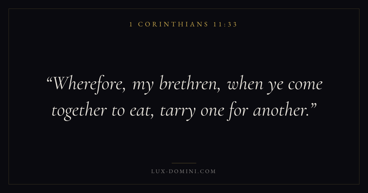 Books / 1 Corinthians / Chapter 11 / Verse 33 ← 1 Corinthians 11:32 1 Corinthians 11:33 1 Corinthians 11:34 → Wherefore, my brethren, when ye come together to eat, tarry one for another. Download verse card Share on Twitter Share on Facebook Pin it ✦ Key themes LoveWisdomEternal lifeThe cross Read with 1 Corinthians 11:301 Corinthians 11:31John 3:161 Corinthians 13:4 Related topics Bible verses about loveBible verses about wisdomBible verses about eternal life ✦ 1 Corinthians Chapter 11 verses V. 1 V. 2 V. 3 V. 4 V. 5 V. 6 V. 7 V. 8 V. 9 V. 10 V. 11 V. 12 V. 13 V. 14 V. 15 V. 16 V. 17 V. 18 V. 19 V. 20 V. 21 V. 22 V. 23 V. 24 V. 25 V. 26 V. 27 V. 28 V. 29 V. 30 V. 31 V. 32 V. 33 V. 34