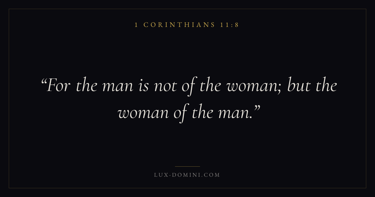 Books / 1 Corinthians / Chapter 11 / Verse 8 ← 1 Corinthians 11:7 1 Corinthians 11:8 1 Corinthians 11:9 → For the man is not of the woman; but the woman of the man. Download verse card Share on Twitter Share on Facebook Pin it ✦ Key themes LoveEternal lifeThe crossChurch order Read with 1 Corinthians 11:41 Corinthians 11:5John 3:161 Corinthians 13:4 Related topics Bible verses about loveBible verses about eternal life ✦ 1 Corinthians Chapter 11 verses V. 1 V. 2 V. 3 V. 4 V. 5 V. 6 V. 7 V. 8 V. 9 V. 10 V. 11 V. 12 V. 13 V. 14 V. 15 V. 16 V. 17 V. 18 V. 19 V. 20 V. 21 V. 22 V. 23 V. 24 V. 25 V. 26 V. 27 V. 28 V. 29 V. 30 V. 31 V. 32 V. 33 V. 34