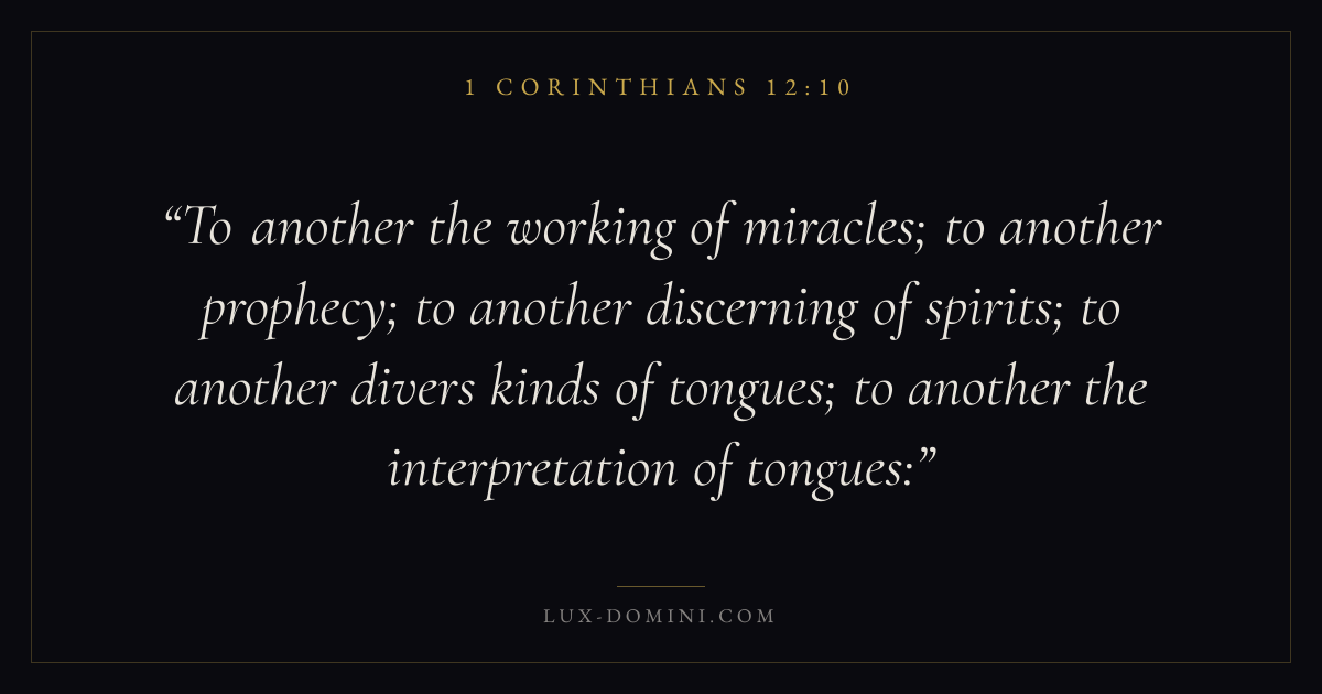 To another the working of miracles; to another prophecy; to another discerning of spirits; to another divers kinds of tongues; to another the interpretation of tongues: