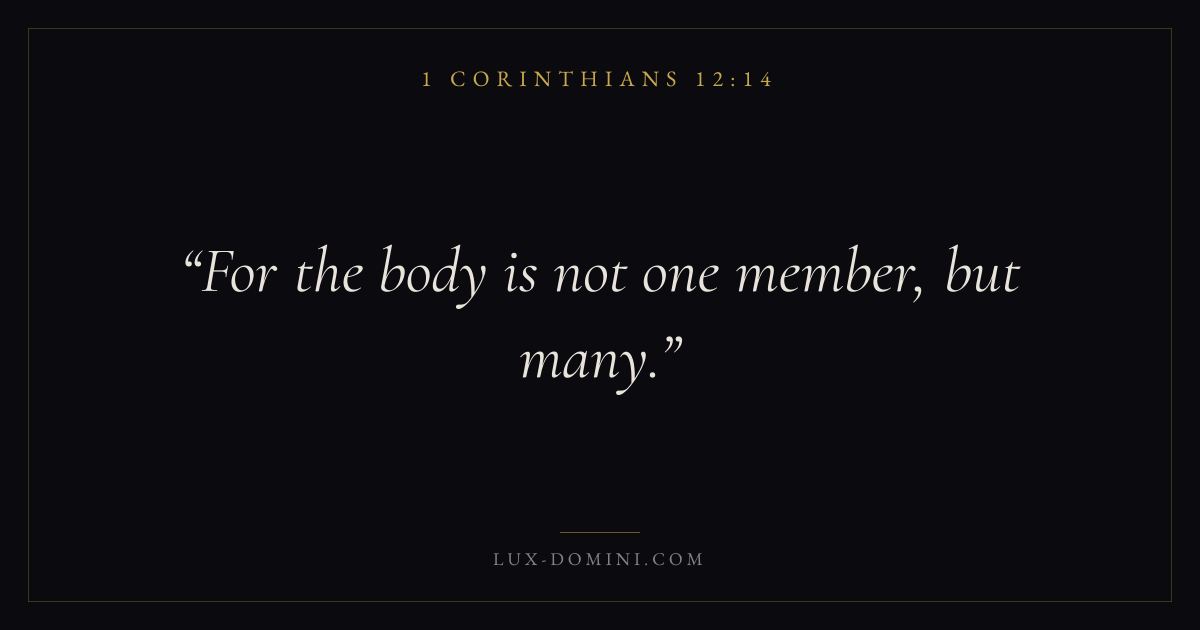 Books / 1 Corinthians / Chapter 12 / Verse 14 ← 1 Corinthians 12:13 1 Corinthians 12:14 1 Corinthians 12:15 → For the body is not one member, but many. Download verse card Share on Twitter Share on Facebook Pin it ✦ Key themes LoveEternal lifeThe crossChurch order Read with 1 Corinthians 12:121 Corinthians 12:13John 3:161 Corinthians 13:4 Related topics Bible verses about loveBible verses about eternal life ✦ 1 Corinthians Chapter 12 verses V. 1 V. 2 V. 3 V. 4 V. 5 V. 6 V. 7 V. 8 V. 9 V. 10 V. 11 V. 12 V. 13 V. 14 V. 15 V. 16 V. 17 V. 18 V. 19 V. 20 V. 21 V. 22 V. 23 V. 24 V. 25 V. 26 V. 27 V. 28 V. 29 V. 30 V. 31