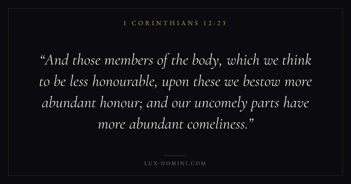 And those members of the body, which we think to be less honourable, upon these we bestow more abundant honour; and our uncomely parts have more abundant comeliness.