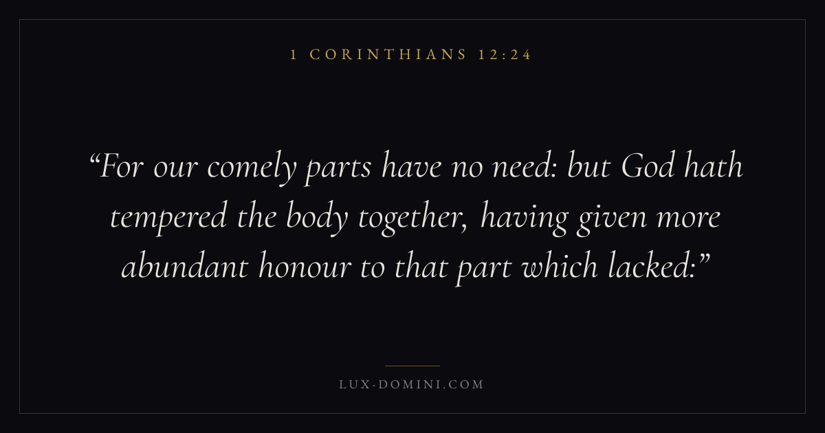 For our comely parts have no need: but God hath tempered the body together, having given more abundant honour to that part which lacked: