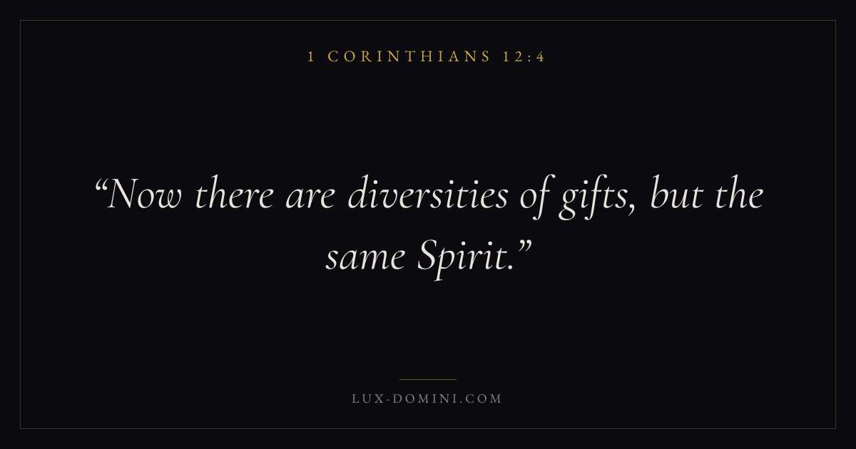 Books / 1 Corinthians / Chapter 12 / Verse 4 ← 1 Corinthians 12:3 1 Corinthians 12:4 1 Corinthians 12:5 → Now there are diversities of gifts, but the same Spirit. Download verse card Share on Twitter Share on Facebook Pin it ✦ Key themes LoveEternal lifeThe crossChurch order Read with 1 Corinthians 12:21 Corinthians 12:3John 3:161 Corinthians 13:4 Related topics Bible verses about loveBible verses about eternal life ✦ 1 Corinthians Chapter 12 verses V. 1 V. 2 V. 3 V. 4 V. 5 V. 6 V. 7 V. 8 V. 9 V. 10 V. 11 V. 12 V. 13 V. 14 V. 15 V. 16 V. 17 V. 18 V. 19 V. 20 V. 21 V. 22 V. 23 V. 24 V. 25 V. 26 V. 27 V. 28 V. 29 V. 30 V. 31