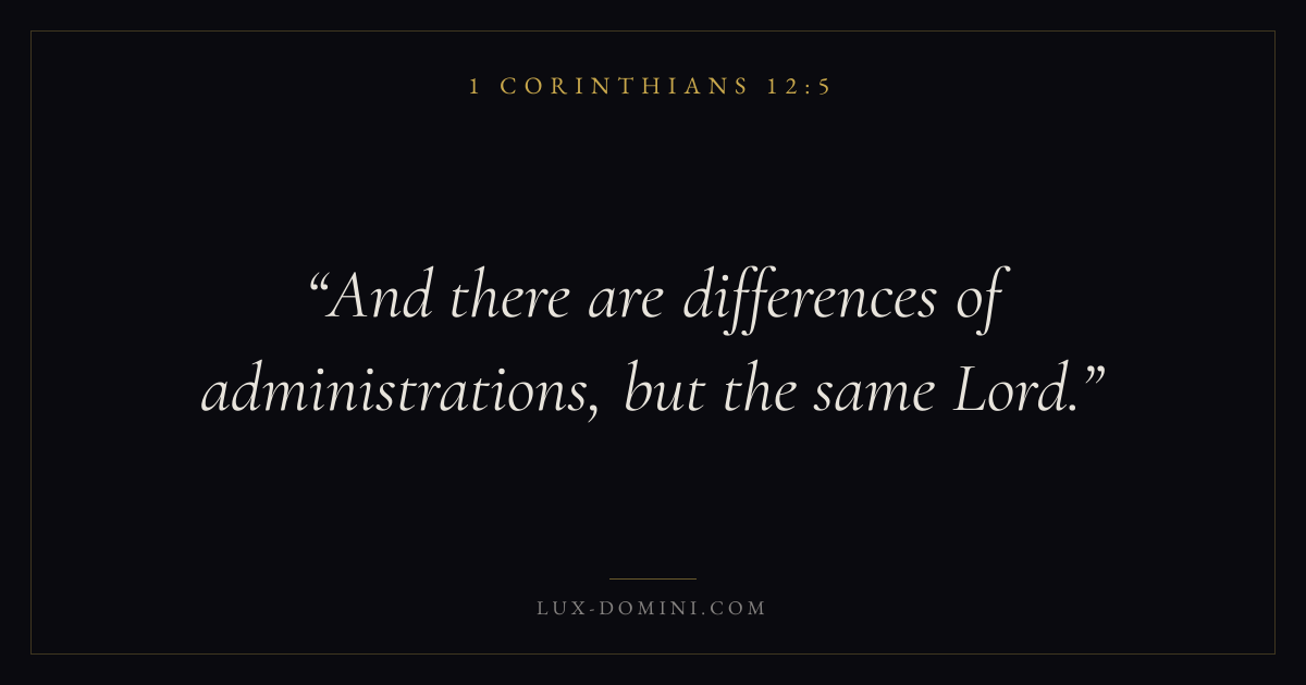 Books / 1 Corinthians / Chapter 12 / Verse 5 ← 1 Corinthians 12:4 1 Corinthians 12:5 1 Corinthians 12:6 → And there are differences of administrations, but the same Lord. Download verse card Share on Twitter Share on Facebook Pin it ✦ Key themes LoveEternal lifeThe crossChurch order Read with 1 Corinthians 12:21 Corinthians 12:3John 3:161 Corinthians 13:4 Related topics Bible verses about loveBible verses about eternal life ✦ 1 Corinthians Chapter 12 verses V. 1 V. 2 V. 3 V. 4 V. 5 V. 6 V. 7 V. 8 V. 9 V. 10 V. 11 V. 12 V. 13 V. 14 V. 15 V. 16 V. 17 V. 18 V. 19 V. 20 V. 21 V. 22 V. 23 V. 24 V. 25 V. 26 V. 27 V. 28 V. 29 V. 30 V. 31