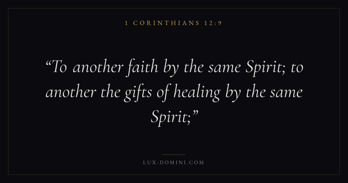 Books / 1 Corinthians / Chapter 12 / Verse 9 ← 1 Corinthians 12:8 1 Corinthians 12:9 1 Corinthians 12:10 → To another faith by the same Spirit; to another the gifts of healing by the same Spirit; Download verse card Share on Twitter Share on Facebook Pin it ✦ Key themes LoveFaithEternal lifeThe cross Read with 1 Corinthians 12:71 Corinthians 12:8John 3:161 Corinthians 13:4 Related topics Bible verses about loveBible verses about faithBible verses about eternal life ✦ 1 Corinthians Chapter 12 verses V. 1 V. 2 V. 3 V. 4 V. 5 V. 6 V. 7 V. 8 V. 9 V. 10 V. 11 V. 12 V. 13 V. 14 V. 15 V. 16 V. 17 V. 18 V. 19 V. 20 V. 21 V. 22 V. 23 V. 24 V. 25 V. 26 V. 27 V. 28 V. 29 V. 30 V. 31