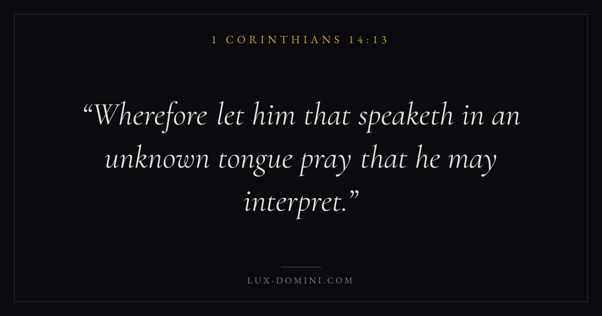 Books / 1 Corinthians / Chapter 14 / Verse 13 ← 1 Corinthians 14:12 1 Corinthians 14:13 1 Corinthians 14:14 → Wherefore let him that speaketh in an unknown tongue pray that he may interpret. Download verse card Share on Twitter Share on Facebook Pin it ✦ Key themes LovePrayerEternal lifeThe cross Read with 1 Corinthians 14:121 Corinthians 14:14John 3:161 Corinthians 13:4 Related topics Bible verses about loveBible verses about prayerBible verses about eternal life ✦ 1 Corinthians Chapter 14 verses V. 1 V. 2 V. 3 V. 4 V. 5 V. 6 V. 7 V. 8 V. 9 V. 10 V. 11 V. 12 V. 13 V. 14 V. 15 V. 16 V. 17 V. 18 V. 19 V. 20 V. 21 V. 22 V. 23 V. 24 V. 25 V. 26 V. 27 V. 28 V. 29 V. 30 V. 31 V. 32 V. 33 V. 34 V. 35 V. 36 V. 37 V. 38 V. 39 V. 40