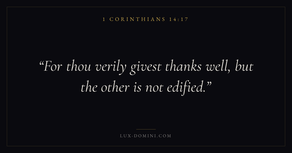 Books / 1 Corinthians / Chapter 14 / Verse 17 ← 1 Corinthians 14:16 1 Corinthians 14:17 1 Corinthians 14:18 → For thou verily givest thanks well, but the other is not edified. Download verse card Share on Twitter Share on Facebook Pin it ✦ Key themes LoveEternal lifeThe crossChurch order Read with 1 Corinthians 14:151 Corinthians 14:16John 3:161 Corinthians 13:4 Related topics Bible verses about loveBible verses about eternal life ✦ 1 Corinthians Chapter 14 verses V. 1 V. 2 V. 3 V. 4 V. 5 V. 6 V. 7 V. 8 V. 9 V. 10 V. 11 V. 12 V. 13 V. 14 V. 15 V. 16 V. 17 V. 18 V. 19 V. 20 V. 21 V. 22 V. 23 V. 24 V. 25 V. 26 V. 27 V. 28 V. 29 V. 30 V. 31 V. 32 V. 33 V. 34 V. 35 V. 36 V. 37 V. 38 V. 39 V. 40