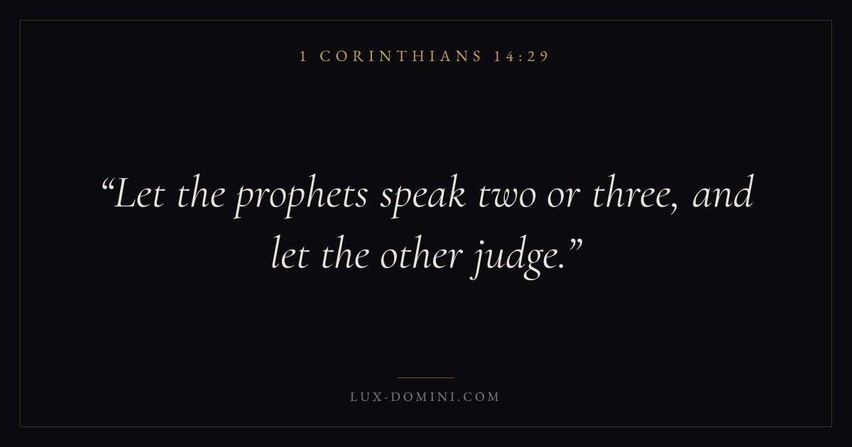 Books / 1 Corinthians / Chapter 14 / Verse 29 ← 1 Corinthians 14:28 1 Corinthians 14:29 1 Corinthians 14:30 → Let the prophets speak two or three, and let the other judge. Download verse card Share on Twitter Share on Facebook Pin it ✦ Key themes LoveFaithJustice and mercyEternal lifeThe cross Read with 1 Corinthians 14:261 Corinthians 14:27John 3:161 Corinthians 13:4 Related topics Bible verses about loveBible verses about faithBible verses about justice and mercyBible verses about eternal life ✦ 1 Corinthians Chapter 14 verses V. 1 V. 2 V. 3 V. 4 V. 5 V. 6 V. 7 V. 8 V. 9 V. 10 V. 11 V. 12 V. 13 V. 14 V. 15 V. 16 V. 17 V. 18 V. 19 V. 20 V. 21 V. 22 V. 23 V. 24 V. 25 V. 26 V. 27 V. 28 V. 29 V. 30 V. 31 V. 32 V. 33 V. 34 V. 35 V. 36 V. 37 V. 38 V. 39 V. 40