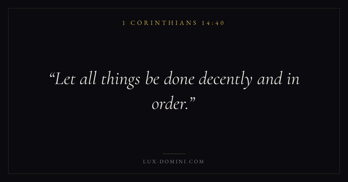 Books / 1 Corinthians / Chapter 14 / Verse 40 ← 1 Corinthians 14:39 1 Corinthians 14:40 1 Corinthians 15:1 → Let all things be done decently and in order. Download verse card Share on Twitter Share on Facebook Pin it ✦ Key themes LoveWisdomEternal lifeThe cross Read with 1 Corinthians 14:371 Corinthians 14:38John 3:161 Corinthians 13:4 Related topics Bible verses about loveBible verses about wisdomBible verses about eternal life ✦ 1 Corinthians Chapter 14 verses V. 1 V. 2 V. 3 V. 4 V. 5 V. 6 V. 7 V. 8 V. 9 V. 10 V. 11 V. 12 V. 13 V. 14 V. 15 V. 16 V. 17 V. 18 V. 19 V. 20 V. 21 V. 22 V. 23 V. 24 V. 25 V. 26 V. 27 V. 28 V. 29 V. 30 V. 31 V. 32 V. 33 V. 34 V. 35 V. 36 V. 37 V. 38 V. 39 V. 40
