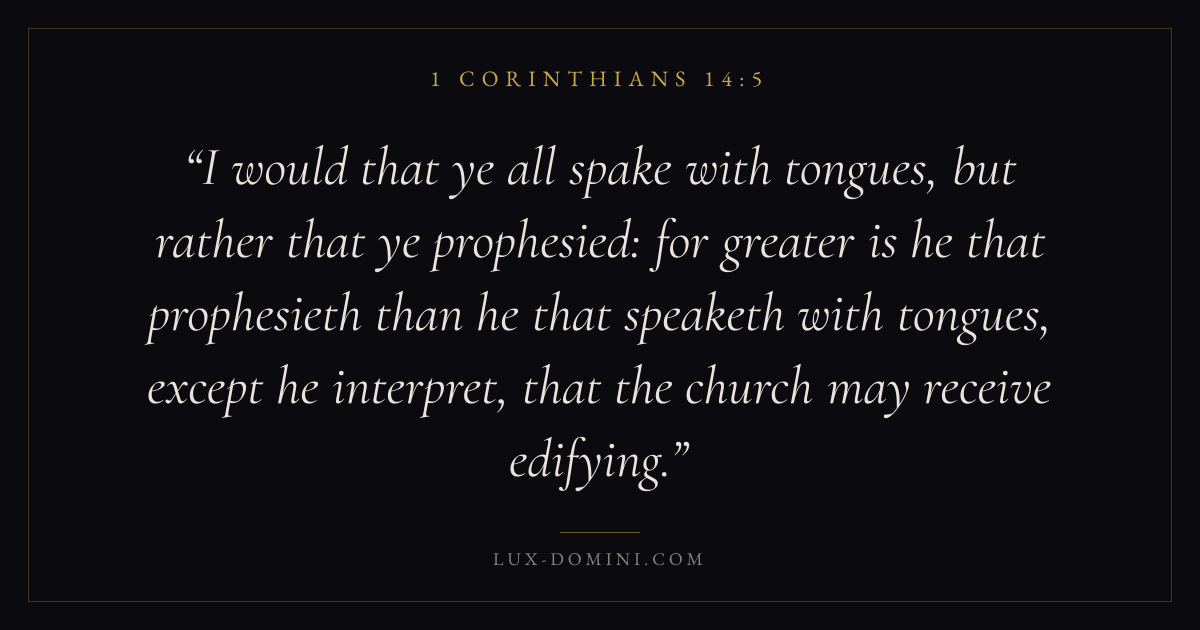 I would that ye all spake with tongues, but rather that ye prophesied: for greater is he that prophesieth than he that speaketh with tongues, except he interpret, that the church may receive edifying.