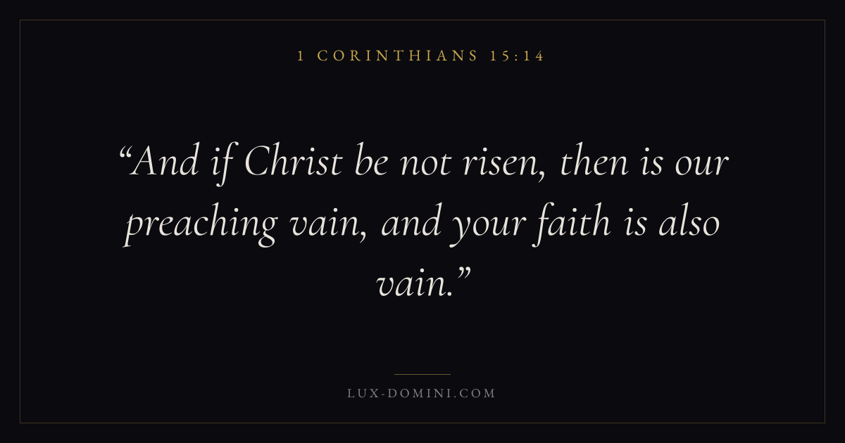 Books / 1 Corinthians / Chapter 15 / Verse 14 ← 1 Corinthians 15:13 1 Corinthians 15:14 1 Corinthians 15:15 → And if Christ be not risen, then is our preaching vain, and your faith is also vain. Download verse card Share on Twitter Share on Facebook Pin it ✦ Key themes LoveFaithSalvationEternal lifeThe cross Read with 1 Corinthians 15:121 Corinthians 15:13John 3:161 Corinthians 13:4 Related topics Bible verses about loveBible verses about faithBible verses about salvationBible verses about eternal life ✦ 1 Corinthians Chapter 15 verses V. 1 V. 2 V. 3 V. 4 V. 5 V. 6 V. 7 V. 8 V. 9 V. 10 V. 11 V. 12 V. 13 V. 14 V. 15 V. 16 V. 17 V. 18 V. 19 V. 20 V. 21 V. 22 V. 23 V. 24 V. 25 V. 26 V. 27 V. 28 V. 29 V. 30 V. 31 V. 32 V. 33 V. 34 V. 35 V. 36 V. 37 V. 38 V. 39 V. 40 V. 41 V. 42 V. 43 V. 44 V. 45 V. 46 V. 47 V. 48 V. 49 V. 50 V. 51 V. 52 V. 53 V. 54 V. 55 V. 56 V. 57 V. 58