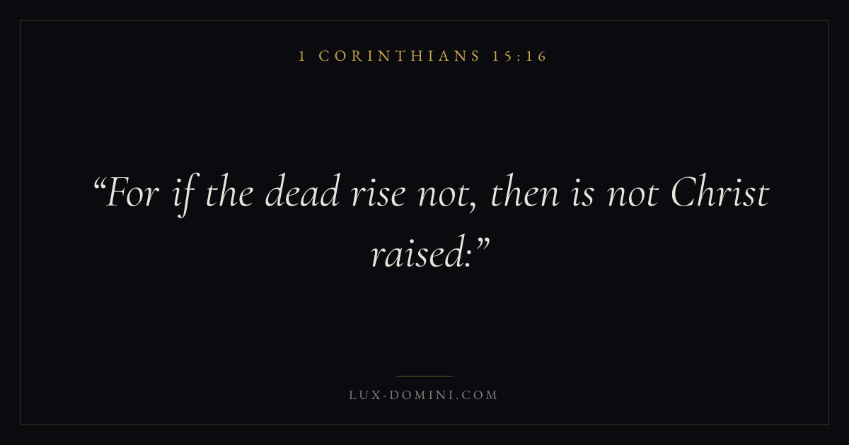Books / 1 Corinthians / Chapter 15 / Verse 16 ← 1 Corinthians 15:15 1 Corinthians 15:16 1 Corinthians 15:17 → For if the dead rise not, then is not Christ raised: Download verse card Share on Twitter Share on Facebook Pin it ✦ Key themes LoveSalvationEternal lifeThe cross Read with 1 Corinthians 15:151 Corinthians 15:17John 3:161 Corinthians 13:4 Related topics Bible verses about loveBible verses about salvationBible verses about eternal life ✦ 1 Corinthians Chapter 15 verses V. 1 V. 2 V. 3 V. 4 V. 5 V. 6 V. 7 V. 8 V. 9 V. 10 V. 11 V. 12 V. 13 V. 14 V. 15 V. 16 V. 17 V. 18 V. 19 V. 20 V. 21 V. 22 V. 23 V. 24 V. 25 V. 26 V. 27 V. 28 V. 29 V. 30 V. 31 V. 32 V. 33 V. 34 V. 35 V. 36 V. 37 V. 38 V. 39 V. 40 V. 41 V. 42 V. 43 V. 44 V. 45 V. 46 V. 47 V. 48 V. 49 V. 50 V. 51 V. 52 V. 53 V. 54 V. 55 V. 56 V. 57 V. 58