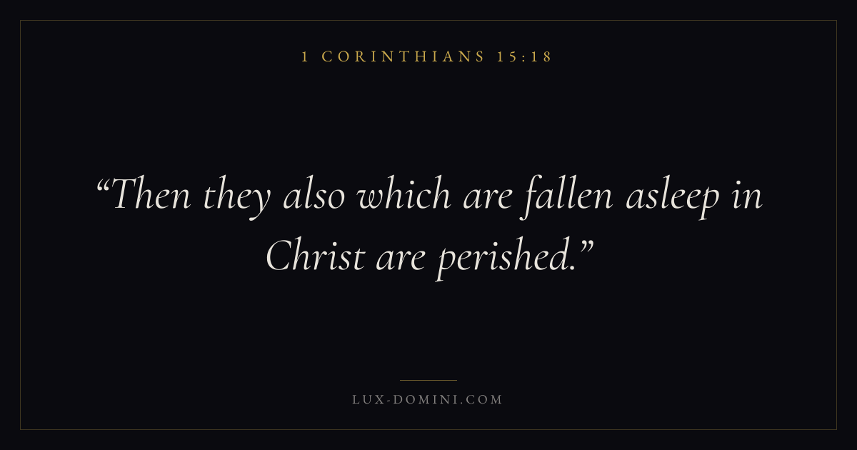 Books / 1 Corinthians / Chapter 15 / Verse 18 ← 1 Corinthians 15:17 1 Corinthians 15:18 1 Corinthians 15:19 → Then they also which are fallen asleep in Christ are perished. Download verse card Share on Twitter Share on Facebook Pin it ✦ Key themes LoveSalvationEternal lifeThe cross Read with 1 Corinthians 15:151 Corinthians 15:16John 3:161 Corinthians 13:4 Related topics Bible verses about loveBible verses about salvationBible verses about eternal life ✦ 1 Corinthians Chapter 15 verses V. 1 V. 2 V. 3 V. 4 V. 5 V. 6 V. 7 V. 8 V. 9 V. 10 V. 11 V. 12 V. 13 V. 14 V. 15 V. 16 V. 17 V. 18 V. 19 V. 20 V. 21 V. 22 V. 23 V. 24 V. 25 V. 26 V. 27 V. 28 V. 29 V. 30 V. 31 V. 32 V. 33 V. 34 V. 35 V. 36 V. 37 V. 38 V. 39 V. 40 V. 41 V. 42 V. 43 V. 44 V. 45 V. 46 V. 47 V. 48 V. 49 V. 50 V. 51 V. 52 V. 53 V. 54 V. 55 V. 56 V. 57 V. 58