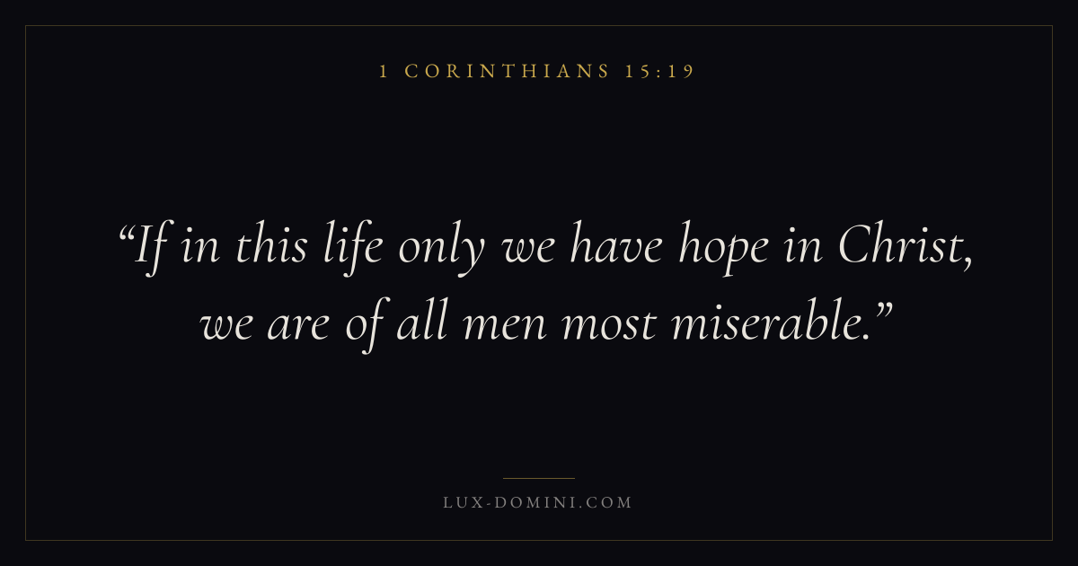 Books / 1 Corinthians / Chapter 15 / Verse 19 ← 1 Corinthians 15:18 1 Corinthians 15:19 1 Corinthians 15:20 → If in this life only we have hope in Christ, we are of all men most miserable. Download verse card Share on Twitter Share on Facebook Pin it ✦ Key themes LoveHopeSalvationEternal lifeThe cross Read with 1 Corinthians 15:201 Corinthians 15:21John 3:161 Corinthians 13:4 Related topics Bible verses about loveBible verses about hopeBible verses about salvationBible verses about eternal life ✦ 1 Corinthians Chapter 15 verses V. 1 V. 2 V. 3 V. 4 V. 5 V. 6 V. 7 V. 8 V. 9 V. 10 V. 11 V. 12 V. 13 V. 14 V. 15 V. 16 V. 17 V. 18 V. 19 V. 20 V. 21 V. 22 V. 23 V. 24 V. 25 V. 26 V. 27 V. 28 V. 29 V. 30 V. 31 V. 32 V. 33 V. 34 V. 35 V. 36 V. 37 V. 38 V. 39 V. 40 V. 41 V. 42 V. 43 V. 44 V. 45 V. 46 V. 47 V. 48 V. 49 V. 50 V. 51 V. 52 V. 53 V. 54 V. 55 V. 56 V. 57 V. 58