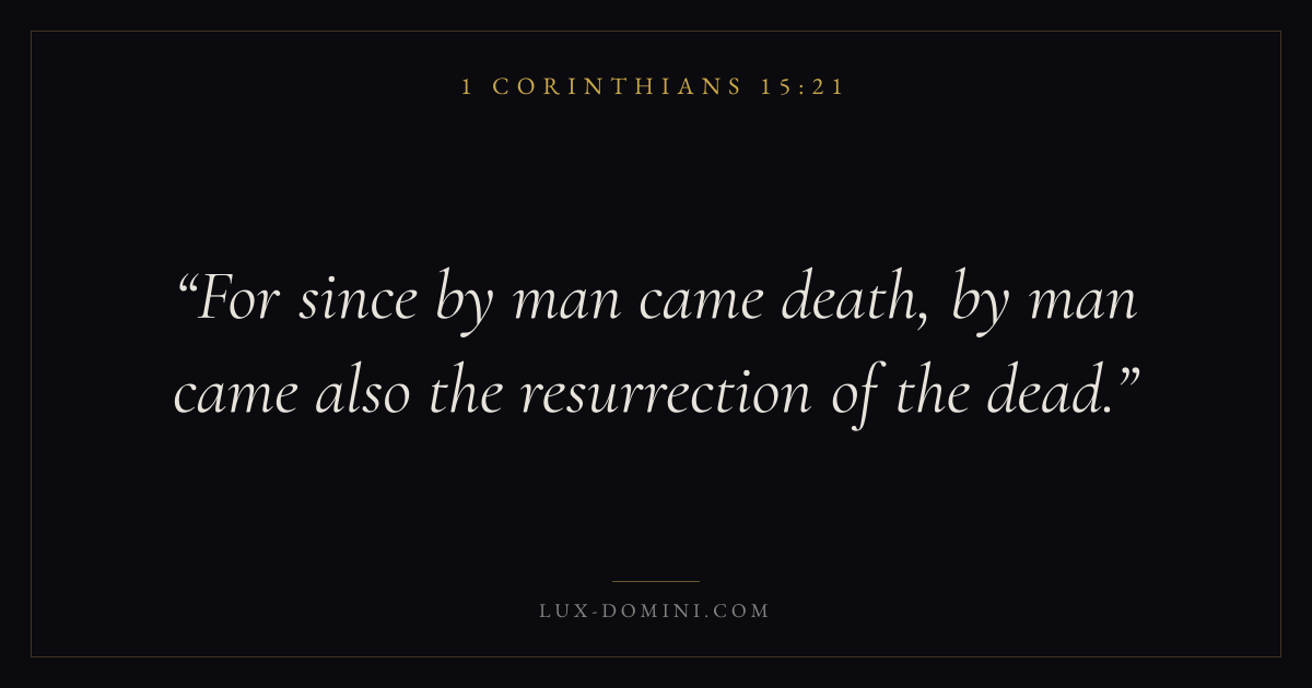 Books / 1 Corinthians / Chapter 15 / Verse 21 ← 1 Corinthians 15:20 1 Corinthians 15:21 1 Corinthians 15:22 → For since by man came death, by man came also the resurrection of the dead. Download verse card Share on Twitter Share on Facebook Pin it ✦ Key themes LoveFaithEternal lifeThe cross Read with 1 Corinthians 15:191 Corinthians 15:20John 3:161 Corinthians 13:4 Related topics Bible verses about loveBible verses about faithBible verses about eternal life ✦ 1 Corinthians Chapter 15 verses V. 1 V. 2 V. 3 V. 4 V. 5 V. 6 V. 7 V. 8 V. 9 V. 10 V. 11 V. 12 V. 13 V. 14 V. 15 V. 16 V. 17 V. 18 V. 19 V. 20 V. 21 V. 22 V. 23 V. 24 V. 25 V. 26 V. 27 V. 28 V. 29 V. 30 V. 31 V. 32 V. 33 V. 34 V. 35 V. 36 V. 37 V. 38 V. 39 V. 40 V. 41 V. 42 V. 43 V. 44 V. 45 V. 46 V. 47 V. 48 V. 49 V. 50 V. 51 V. 52 V. 53 V. 54 V. 55 V. 56 V. 57 V. 58
