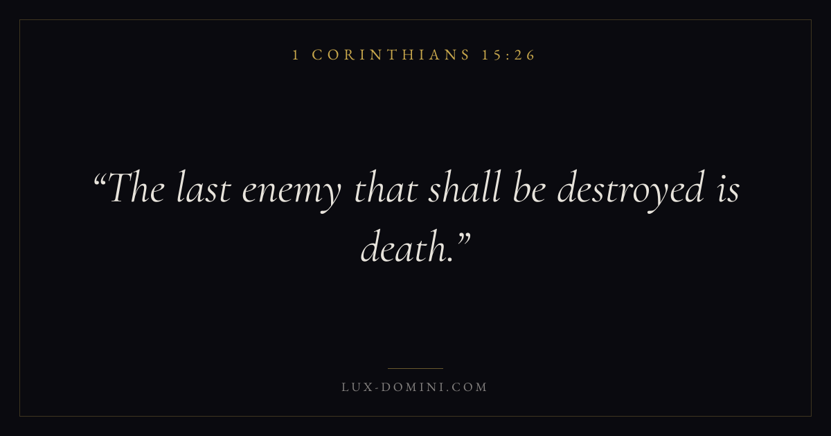 Books / 1 Corinthians / Chapter 15 / Verse 26 ← 1 Corinthians 15:25 1 Corinthians 15:26 1 Corinthians 15:27 → The last enemy that shall be destroyed is death. Download verse card Share on Twitter Share on Facebook Pin it ✦ Key themes LoveFaithEternal lifeThe cross Read with 1 Corinthians 15:271 Corinthians 15:28John 3:161 Corinthians 13:4 Related topics Bible verses about loveBible verses about faithBible verses about eternal life ✦ 1 Corinthians Chapter 15 verses V. 1 V. 2 V. 3 V. 4 V. 5 V. 6 V. 7 V. 8 V. 9 V. 10 V. 11 V. 12 V. 13 V. 14 V. 15 V. 16 V. 17 V. 18 V. 19 V. 20 V. 21 V. 22 V. 23 V. 24 V. 25 V. 26 V. 27 V. 28 V. 29 V. 30 V. 31 V. 32 V. 33 V. 34 V. 35 V. 36 V. 37 V. 38 V. 39 V. 40 V. 41 V. 42 V. 43 V. 44 V. 45 V. 46 V. 47 V. 48 V. 49 V. 50 V. 51 V. 52 V. 53 V. 54 V. 55 V. 56 V. 57 V. 58