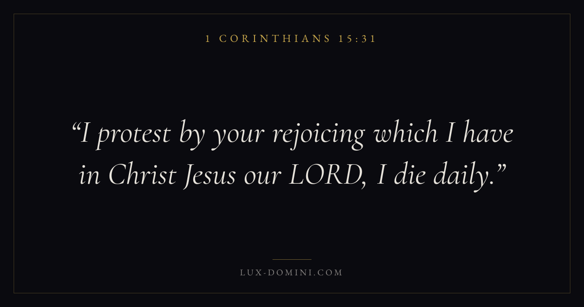 Books / 1 Corinthians / Chapter 15 / Verse 31 ← 1 Corinthians 15:30 1 Corinthians 15:31 1 Corinthians 15:32 → I protest by your rejoicing which I have in Christ Jesus our LORD, I die daily. Download verse card Share on Twitter Share on Facebook Pin it ✦ Key themes LoveFaithEternal lifeThe cross Read with 1 Corinthians 15:32John 3:161 Corinthians 13:4Hebrews 11:1 Related topics Bible verses about loveBible verses about faithBible verses about eternal life ✦ 1 Corinthians Chapter 15 verses V. 1 V. 2 V. 3 V. 4 V. 5 V. 6 V. 7 V. 8 V. 9 V. 10 V. 11 V. 12 V. 13 V. 14 V. 15 V. 16 V. 17 V. 18 V. 19 V. 20 V. 21 V. 22 V. 23 V. 24 V. 25 V. 26 V. 27 V. 28 V. 29 V. 30 V. 31 V. 32 V. 33 V. 34 V. 35 V. 36 V. 37 V. 38 V. 39 V. 40 V. 41 V. 42 V. 43 V. 44 V. 45 V. 46 V. 47 V. 48 V. 49 V. 50 V. 51 V. 52 V. 53 V. 54 V. 55 V. 56 V. 57 V. 58