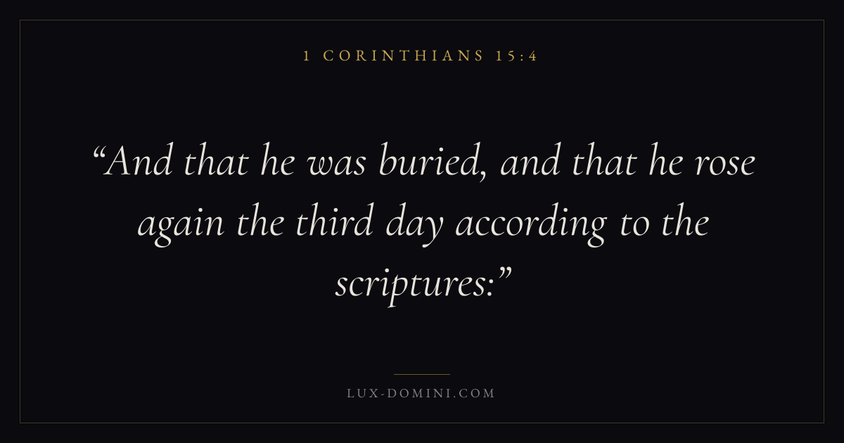 Books / 1 Corinthians / Chapter 15 / Verse 4 ← 1 Corinthians 15:3 1 Corinthians 15:4 1 Corinthians 15:5 → And that he was buried, and that he rose again the third day according to the scriptures: Download verse card Share on Twitter Share on Facebook Pin it ✦ Key themes LoveEternal lifeTruthThe cross Read with 1 Corinthians 15:11 Corinthians 15:2John 3:161 Corinthians 13:4 Related topics Bible verses about loveBible verses about eternal lifeBible verses about truth ✦ 1 Corinthians Chapter 15 verses V. 1 V. 2 V. 3 V. 4 V. 5 V. 6 V. 7 V. 8 V. 9 V. 10 V. 11 V. 12 V. 13 V. 14 V. 15 V. 16 V. 17 V. 18 V. 19 V. 20 V. 21 V. 22 V. 23 V. 24 V. 25 V. 26 V. 27 V. 28 V. 29 V. 30 V. 31 V. 32 V. 33 V. 34 V. 35 V. 36 V. 37 V. 38 V. 39 V. 40 V. 41 V. 42 V. 43 V. 44 V. 45 V. 46 V. 47 V. 48 V. 49 V. 50 V. 51 V. 52 V. 53 V. 54 V. 55 V. 56 V. 57 V. 58