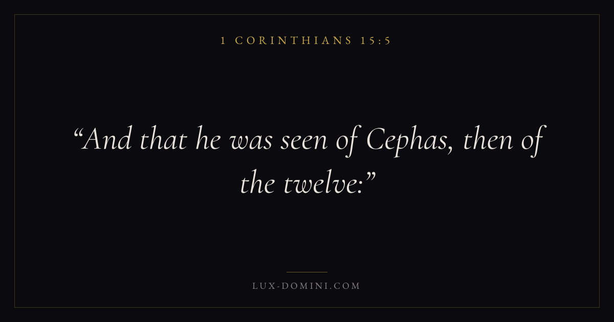 Books / 1 Corinthians / Chapter 15 / Verse 5 ← 1 Corinthians 15:4 1 Corinthians 15:5 1 Corinthians 15:6 → And that he was seen of Cephas, then of the twelve: Download verse card Share on Twitter Share on Facebook Pin it ✦ Key themes LoveEternal lifeTruthThe cross Read with 1 Corinthians 15:11 Corinthians 15:2John 3:161 Corinthians 13:4 Related topics Bible verses about loveBible verses about eternal lifeBible verses about truth ✦ 1 Corinthians Chapter 15 verses V. 1 V. 2 V. 3 V. 4 V. 5 V. 6 V. 7 V. 8 V. 9 V. 10 V. 11 V. 12 V. 13 V. 14 V. 15 V. 16 V. 17 V. 18 V. 19 V. 20 V. 21 V. 22 V. 23 V. 24 V. 25 V. 26 V. 27 V. 28 V. 29 V. 30 V. 31 V. 32 V. 33 V. 34 V. 35 V. 36 V. 37 V. 38 V. 39 V. 40 V. 41 V. 42 V. 43 V. 44 V. 45 V. 46 V. 47 V. 48 V. 49 V. 50 V. 51 V. 52 V. 53 V. 54 V. 55 V. 56 V. 57 V. 58