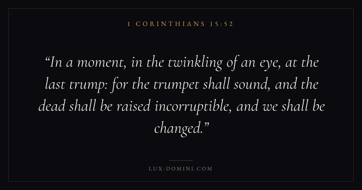 In a moment, in the twinkling of an eye, at the last trump: for the trumpet shall sound, and the dead shall be raised incorruptible, and we shall be changed.