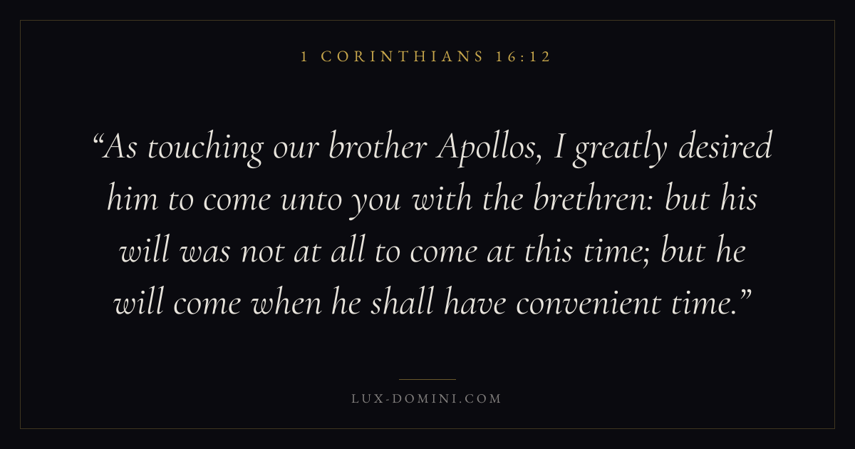 As touching our brother Apollos, I greatly desired him to come unto you with the brethren: but his will was not at all to come at this time; but he will come when he shall have convenient time.