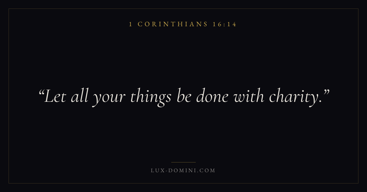 Books / 1 Corinthians / Chapter 16 / Verse 14 ← 1 Corinthians 16:13 1 Corinthians 16:14 1 Corinthians 16:15 → Let all your things be done with charity. Download verse card Share on Twitter Share on Facebook Pin it ✦ Key themes LoveEternal lifeThe crossChurch order Read with 1 Corinthians 16:13John 3:161 Corinthians 13:4John 17:3 Related topics Bible verses about loveBible verses about eternal life ✦ 1 Corinthians Chapter 16 verses V. 1 V. 2 V. 3 V. 4 V. 5 V. 6 V. 7 V. 8 V. 9 V. 10 V. 11 V. 12 V. 13 V. 14 V. 15 V. 16 V. 17 V. 18 V. 19 V. 20 V. 21 V. 22 V. 23 V. 24