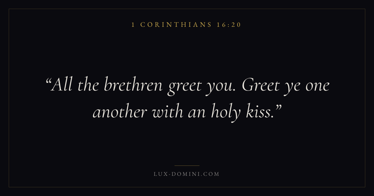 Books / 1 Corinthians / Chapter 16 / Verse 20 ← 1 Corinthians 16:19 1 Corinthians 16:20 1 Corinthians 16:21 → All the brethren greet you. Greet ye one another with an holy kiss. Download verse card Share on Twitter Share on Facebook Pin it ✦ Key themes LoveEternal lifeThe crossChurch order Read with 1 Corinthians 16:19John 3:161 Corinthians 13:4John 17:3 Related topics Bible verses about loveBible verses about eternal life ✦ 1 Corinthians Chapter 16 verses V. 1 V. 2 V. 3 V. 4 V. 5 V. 6 V. 7 V. 8 V. 9 V. 10 V. 11 V. 12 V. 13 V. 14 V. 15 V. 16 V. 17 V. 18 V. 19 V. 20 V. 21 V. 22 V. 23 V. 24