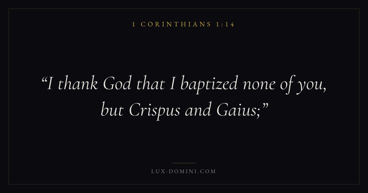 Books / 1 Corinthians / Chapter 1 / Verse 14 ← 1 Corinthians 1:13 1 Corinthians 1:14 1 Corinthians 1:15 → I thank God that I baptized none of you, but Crispus and Gaius; Download verse card Share on Twitter Share on Facebook Pin it ✦ Key themes LovePeaceEternal lifeThe cross Read with 1 Corinthians 1:151 Corinthians 1:16John 3:161 Corinthians 13:4 Related topics Bible verses about loveBible verses about peaceBible verses about eternal life ✦ 1 Corinthians Chapter 1 verses V. 1 V. 2 V. 3 V. 4 V. 5 V. 6 V. 7 V. 8 V. 9 V. 10 V. 11 V. 12 V. 13 V. 14 V. 15 V. 16 V. 17 V. 18 V. 19 V. 20 V. 21 V. 22 V. 23 V. 24 V. 25 V. 26 V. 27 V. 28 V. 29 V. 30 V. 31
