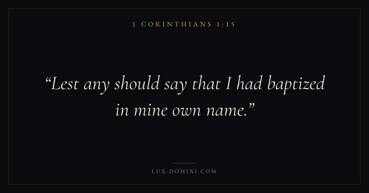 Books / 1 Corinthians / Chapter 1 / Verse 15 ← 1 Corinthians 1:14 1 Corinthians 1:15 1 Corinthians 1:16 → Lest any should say that I had baptized in mine own name. Download verse card Share on Twitter Share on Facebook Pin it ✦ Key themes LovePeaceEternal lifeThe cross Read with 1 Corinthians 1:141 Corinthians 1:16John 3:161 Corinthians 13:4 Related topics Bible verses about loveBible verses about peaceBible verses about eternal life ✦ 1 Corinthians Chapter 1 verses V. 1 V. 2 V. 3 V. 4 V. 5 V. 6 V. 7 V. 8 V. 9 V. 10 V. 11 V. 12 V. 13 V. 14 V. 15 V. 16 V. 17 V. 18 V. 19 V. 20 V. 21 V. 22 V. 23 V. 24 V. 25 V. 26 V. 27 V. 28 V. 29 V. 30 V. 31