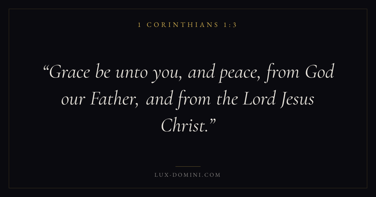 Books / 1 Corinthians / Chapter 1 / Verse 3 ← 1 Corinthians 1:2 1 Corinthians 1:3 1 Corinthians 1:4 → Grace be unto you, and peace, from God our Father, and from the Lord Jesus Christ. Download verse card Share on Twitter Share on Facebook Pin it ✦ Key themes LovePeaceEternal lifeGraceThe cross Read with 1 Corinthians 1:11 Corinthians 1:2John 3:161 Corinthians 13:4 Related topics Bible verses about loveBible verses about peaceBible verses about eternal lifeBible verses about grace ✦ 1 Corinthians Chapter 1 verses V. 1 V. 2 V. 3 V. 4 V. 5 V. 6 V. 7 V. 8 V. 9 V. 10 V. 11 V. 12 V. 13 V. 14 V. 15 V. 16 V. 17 V. 18 V. 19 V. 20 V. 21 V. 22 V. 23 V. 24 V. 25 V. 26 V. 27 V. 28 V. 29 V. 30 V. 31