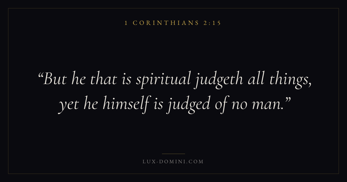 Books / 1 Corinthians / Chapter 2 / Verse 15 ← 1 Corinthians 2:14 1 Corinthians 2:15 1 Corinthians 2:16 → But he that is spiritual judgeth all things, yet he himself is judged of no man. Download verse card Share on Twitter Share on Facebook Pin it ✦ Key themes LoveWisdomEternal lifeTruthThe cross Read with 1 Corinthians 2:131 Corinthians 2:14John 3:161 Corinthians 13:4 Related topics Bible verses about loveBible verses about wisdomBible verses about eternal lifeBible verses about truth ✦ 1 Corinthians Chapter 2 verses V. 1 V. 2 V. 3 V. 4 V. 5 V. 6 V. 7 V. 8 V. 9 V. 10 V. 11 V. 12 V. 13 V. 14 V. 15 V. 16