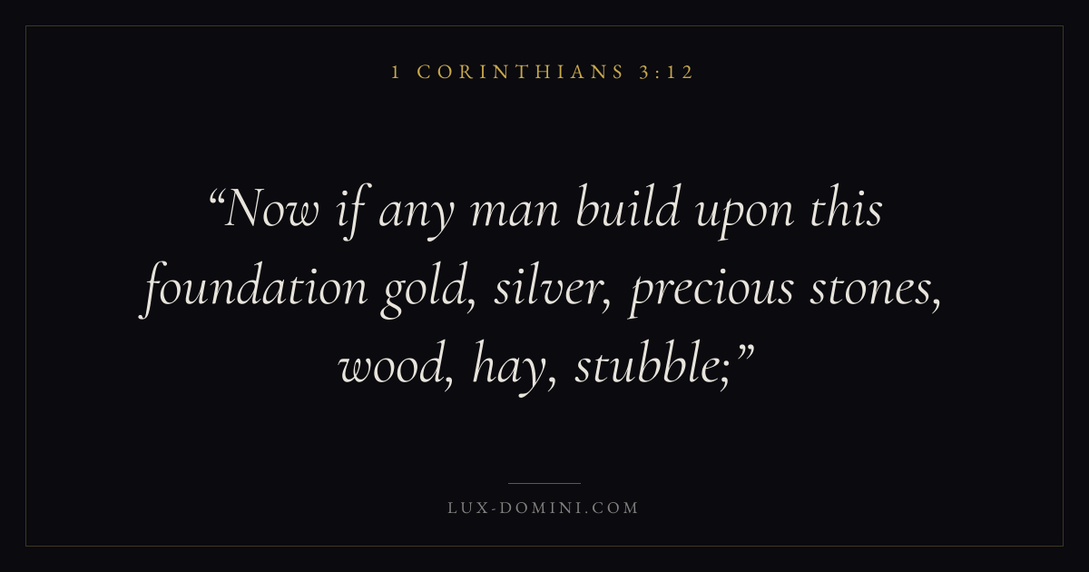 Books / 1 Corinthians / Chapter 3 / Verse 12 ← 1 Corinthians 3:11 1 Corinthians 3:12 1 Corinthians 3:13 → Now if any man build upon this foundation gold, silver, precious stones, wood, hay, stubble; Download verse card Share on Twitter Share on Facebook Pin it ✦ Key themes LoveWisdomEternal lifeGraceThe cross Read with 1 Corinthians 3:101 Corinthians 3:11John 3:161 Corinthians 13:4 Related topics Bible verses about loveBible verses about wisdomBible verses about eternal lifeBible verses about grace ✦ 1 Corinthians Chapter 3 verses V. 1 V. 2 V. 3 V. 4 V. 5 V. 6 V. 7 V. 8 V. 9 V. 10 V. 11 V. 12 V. 13 V. 14 V. 15 V. 16 V. 17 V. 18 V. 19 V. 20 V. 21 V. 22 V. 23