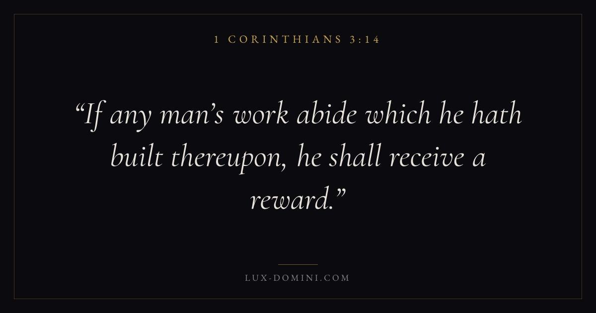 Books / 1 Corinthians / Chapter 3 / Verse 14 ← 1 Corinthians 3:13 1 Corinthians 3:14 1 Corinthians 3:15 → If any man’s work abide which he hath built thereupon, he shall receive a reward. Download verse card Share on Twitter Share on Facebook Pin it ✦ Key themes LoveWisdomEternal lifeGraceThe cross Read with 1 Corinthians 3:15John 3:161 Corinthians 13:4Proverbs 1:7 Related topics Bible verses about loveBible verses about wisdomBible verses about eternal lifeBible verses about grace ✦ 1 Corinthians Chapter 3 verses V. 1 V. 2 V. 3 V. 4 V. 5 V. 6 V. 7 V. 8 V. 9 V. 10 V. 11 V. 12 V. 13 V. 14 V. 15 V. 16 V. 17 V. 18 V. 19 V. 20 V. 21 V. 22 V. 23