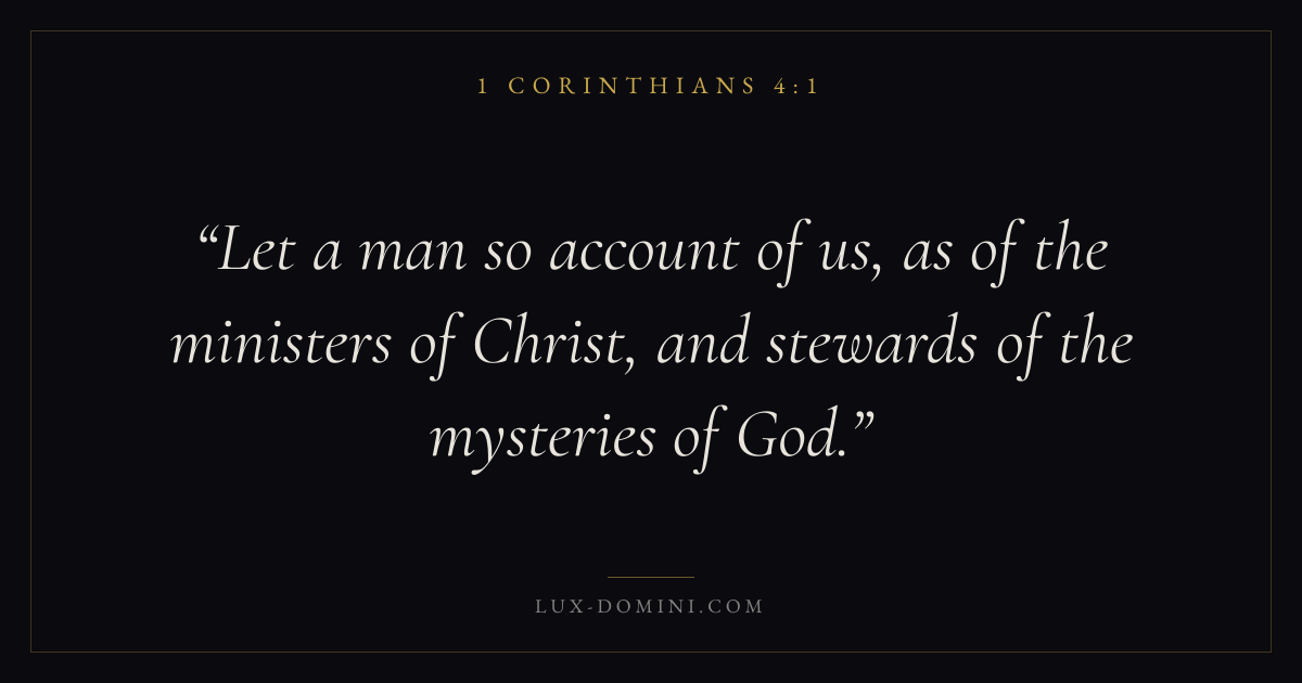 Books / 1 Corinthians / Chapter 4 / Verse 1 ← 1 Corinthians 3:23 1 Corinthians 4:1 1 Corinthians 4:2 → Let a man so account of us, as of the ministers of Christ, and stewards of the mysteries of God. Download verse card Share on Twitter Share on Facebook Pin it ✦ Key themes LoveFaithEternal lifeThe cross Read with John 3:161 Corinthians 13:4Hebrews 11:1Romans 10:17 Related topics Bible verses about loveBible verses about faithBible verses about eternal life ✦ 1 Corinthians Chapter 4 verses V. 1 V. 2 V. 3 V. 4 V. 5 V. 6 V. 7 V. 8 V. 9 V. 10 V. 11 V. 12 V. 13 V. 14 V. 15 V. 16 V. 17 V. 18 V. 19 V. 20 V. 21