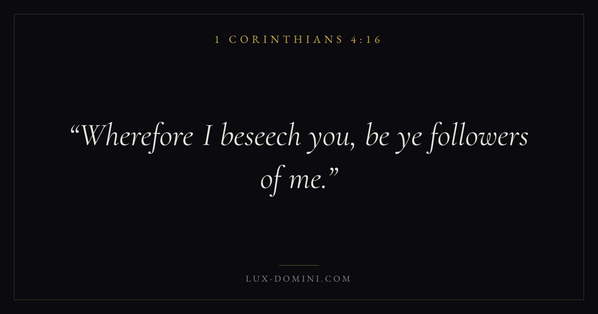 Books / 1 Corinthians / Chapter 4 / Verse 16 ← 1 Corinthians 4:15 1 Corinthians 4:16 1 Corinthians 4:17 → Wherefore I beseech you, be ye followers of me. Download verse card Share on Twitter Share on Facebook Pin it ✦ Key themes LoveFaithEternal lifeThe cross Read with 1 Corinthians 4:141 Corinthians 4:15John 3:161 Corinthians 13:4 Related topics Bible verses about loveBible verses about faithBible verses about eternal life ✦ 1 Corinthians Chapter 4 verses V. 1 V. 2 V. 3 V. 4 V. 5 V. 6 V. 7 V. 8 V. 9 V. 10 V. 11 V. 12 V. 13 V. 14 V. 15 V. 16 V. 17 V. 18 V. 19 V. 20 V. 21