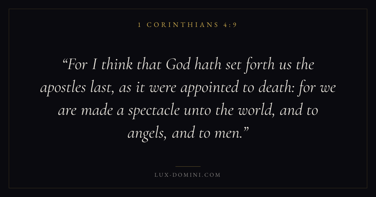 For I think that God hath set forth us the apostles last, as it were appointed to death: for we are made a spectacle unto the world, and to angels, and to men.