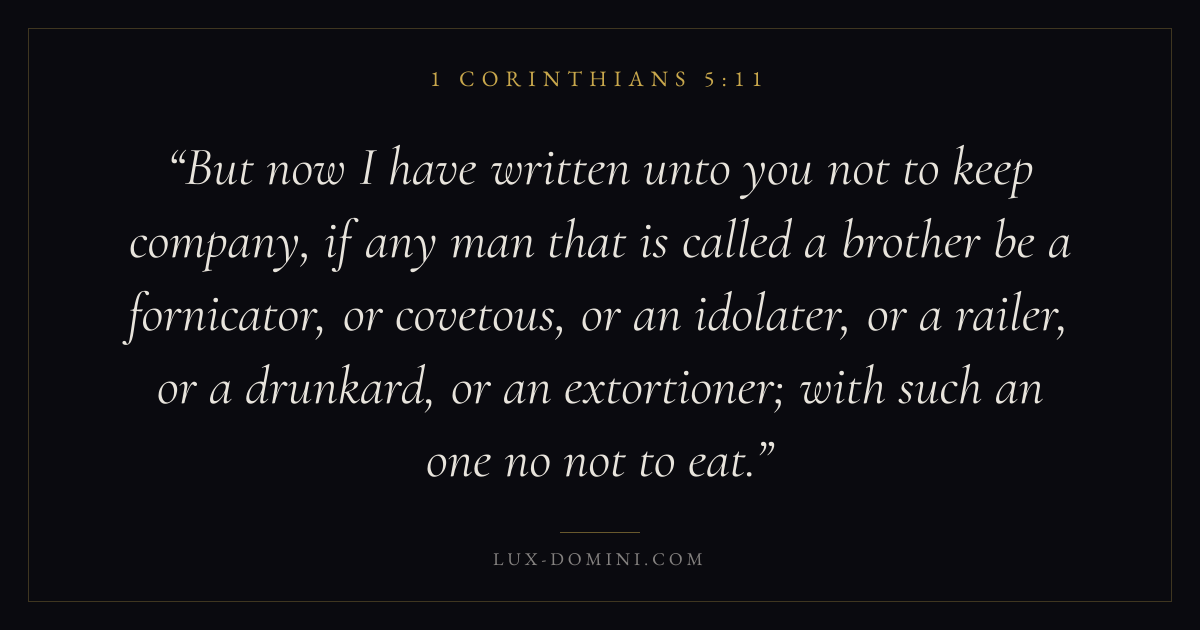 But now I have written unto you not to keep company, if any man that is called a brother be a fornicator, or covetous, or an idolater, or a railer, or a drunkard, or an extortioner; with such an one no not to eat.
