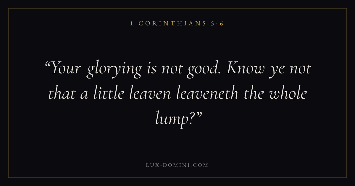 Books / 1 Corinthians / Chapter 5 / Verse 6 ← 1 Corinthians 5:5 1 Corinthians 5:6 1 Corinthians 5:7 → Your glorying is not good. Know ye not that a little leaven leaveneth the whole lump? Download verse card Share on Twitter Share on Facebook Pin it ✦ Key themes LoveSalvationEternal lifeThe cross Read with 1 Corinthians 5:71 Corinthians 5:8John 3:161 Corinthians 13:4 Related topics Bible verses about loveBible verses about salvationBible verses about eternal life ✦ 1 Corinthians Chapter 5 verses V. 1 V. 2 V. 3 V. 4 V. 5 V. 6 V. 7 V. 8 V. 9 V. 10 V. 11 V. 12 V. 13