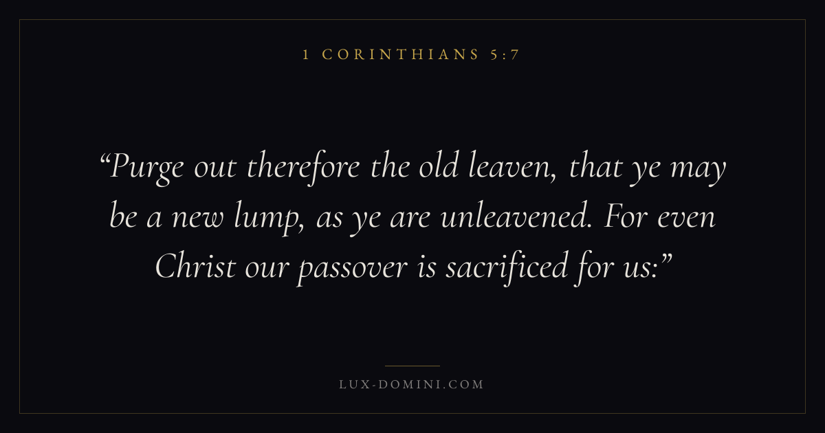 Purge out therefore the old leaven, that ye may be a new lump, as ye are unleavened. For even Christ our passover is sacrificed for us: